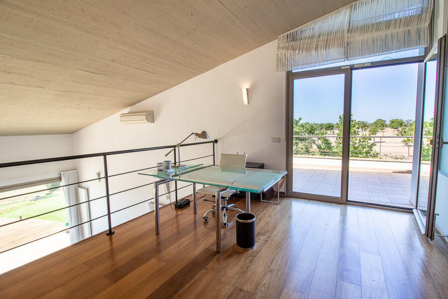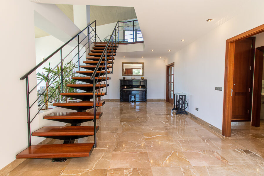 Eine elegante, offene Holztreppe führt in die erste Etage, die ganz mit Parkett ausgelegt ist. Auf der Galerie befindet sich ein großzügiger Arbeitsbereich. Desweiteren liegt hier ein großes Doppelschlafzimmer mit Bad en Suite und Ausgang auf den Balkon mit fantastischem Blick.
