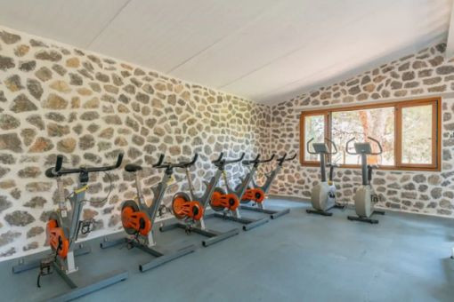 Etwa 50 Meter vom Haupthaus entfernt liegt das Gästehaus mit ca. 85 qm Wohnfläche, das derzeit als Fitnessraum mit Sauna, einem Schlafzimmer und einem Badezimmer genutzt wird.