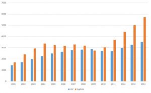 Abbildung 1: gemeldete HIV und Syphilis Infektionen in Deutschland 2001-2014, basierend auf den Daten des Robert-Koch-Instituts, Berlin