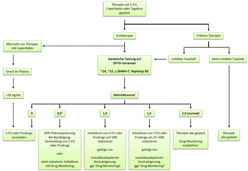 Ist eine systemische Tumortherapie mit FU-haltiger Arzneimitteln geplant, so sollten die empfohlen Leitlinien zur Diagnostik vor und während FU-haltiger Therapie beachtet werden (siehe Abbildung 1).